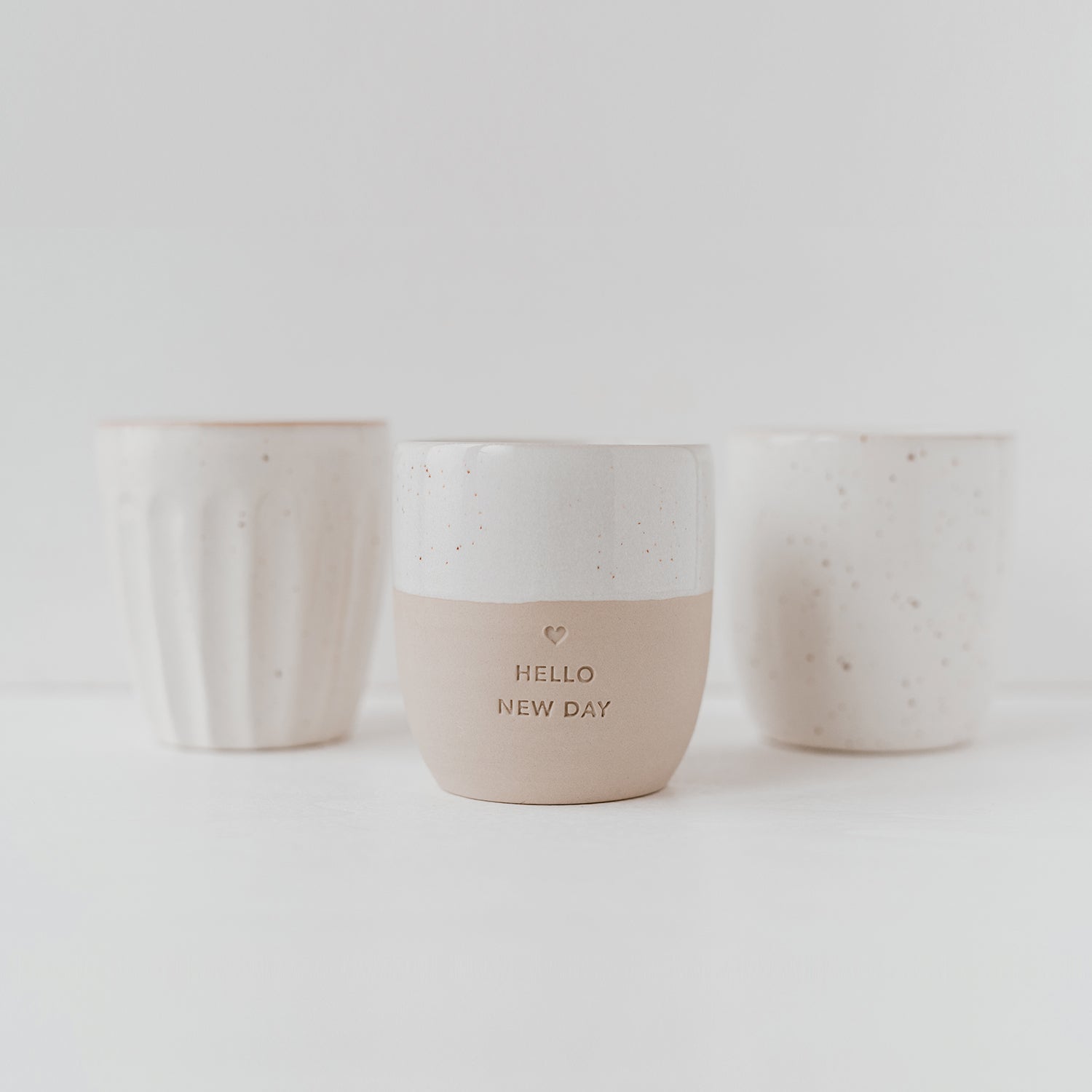 Eine kleine Töpferei aus Portugal produziert diese wundervollen Becher in liebevoller Handarbeit & ist ein großartiger neuer Begleiter auf unserem kreativen Weg. Die Becher lassen die Herzen höher schlagen, die die Individualität von Ton & Glasur lieben, denn jeder einzelne Becher hat seinen ganz eigenen Touch. Da alle Becher mit der Hand gefertigt, gebrannt, geprägt, abgeschliffen, geglazt & nochmal gebrannt werden, gibt es Unterschiede in der Drucktiefe, in der Höhe sowie der Geradlinigkeit. Das minimalistische Design und die natürlichen Farbnuancen werden von einer wunderschönen Blindprägung "Hello New Day" abgerundet.
