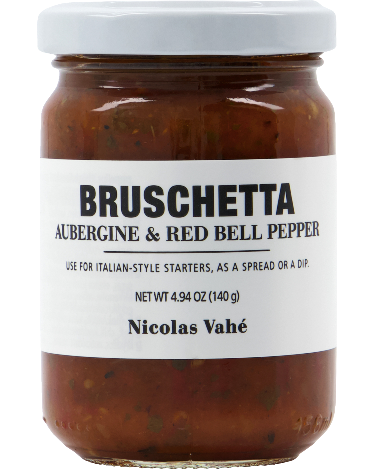 Erlebe den authentischen Geschmack des Südens: Die Bruschetta von Nicolas Vahé vereint aromatische Auberginen mit fruchtigen, roten Paprika zu einer herzhaften Feinkost-Komposition.