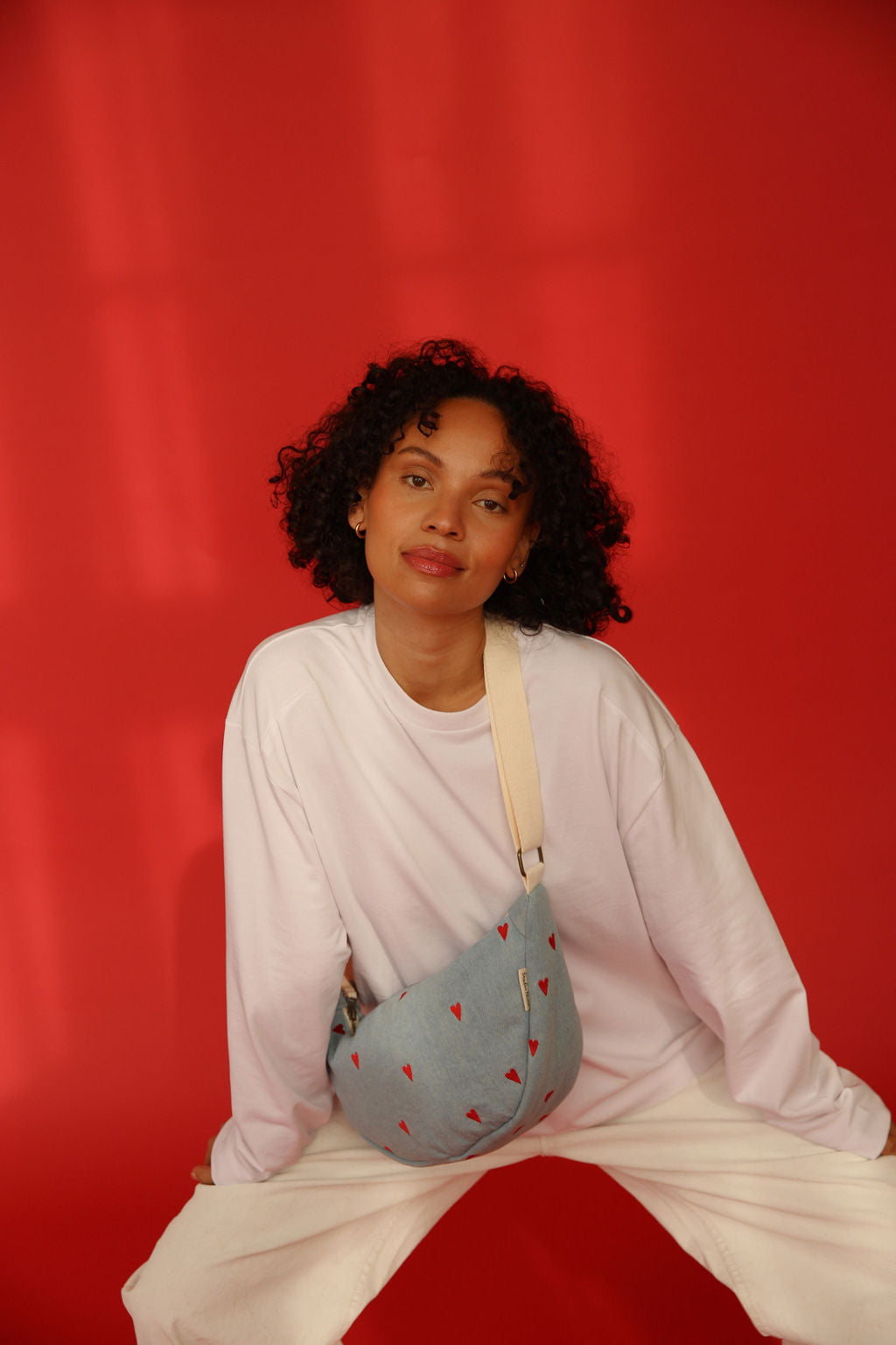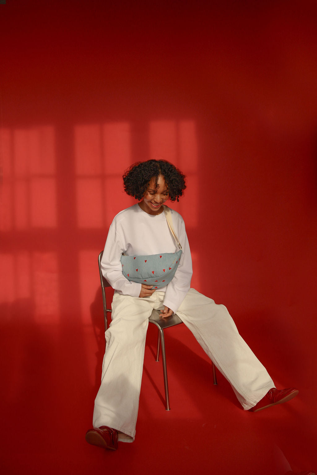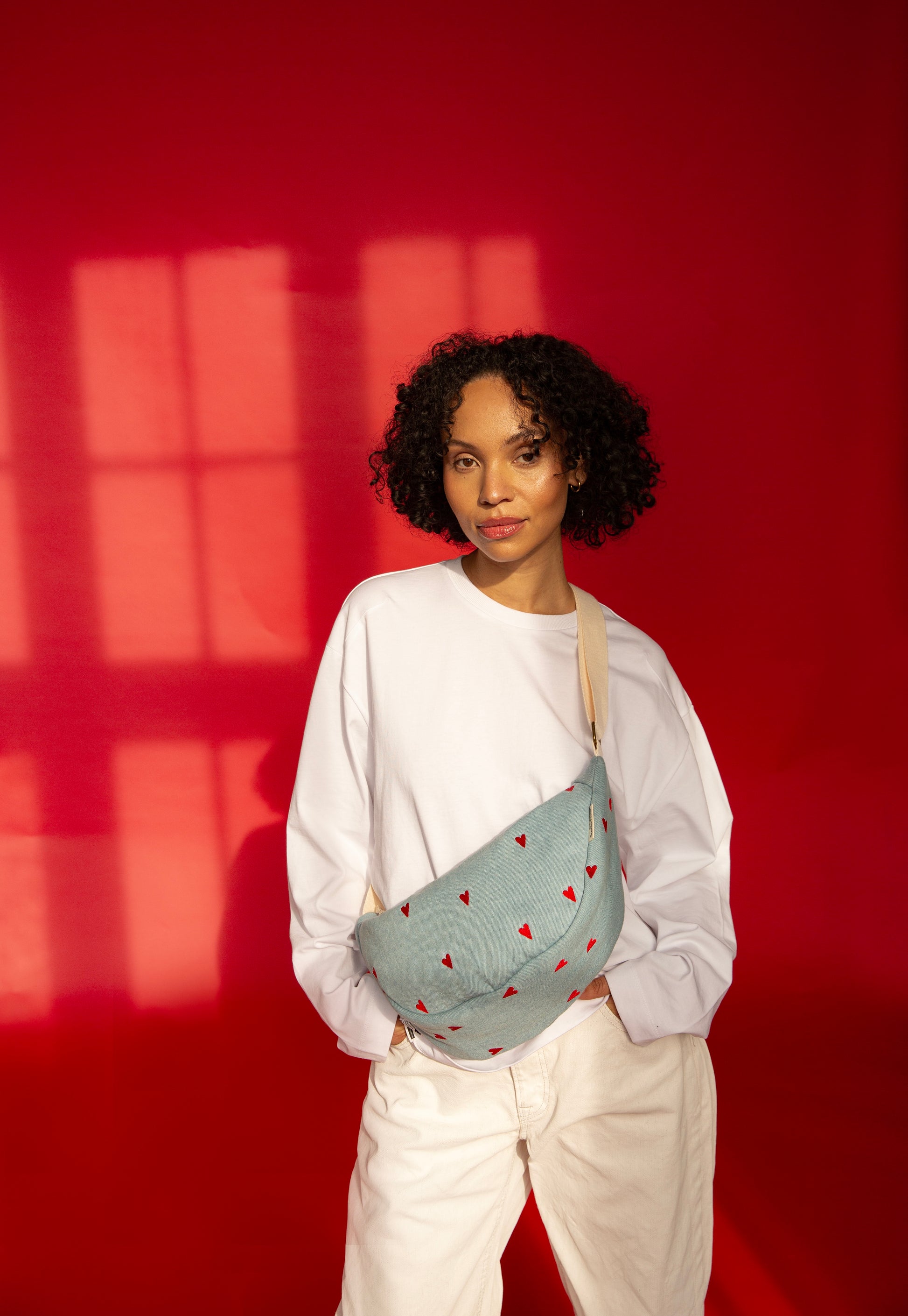 Gefertigt aus 100 % Baumwolle mit einem charmanten Denim-Hearts-Muster, verbindet diese Tasche Funktionalität mit lässigem Design. Ob beim Spaziergang, City-Trip oder auf dem Spielplatz – dieses Fanny Pack passt sich deinem Alltag mühelos an. Und das Beste: Die Tasche ist waschbar – ideal für aktive Tage und ein langes Taschenleben.