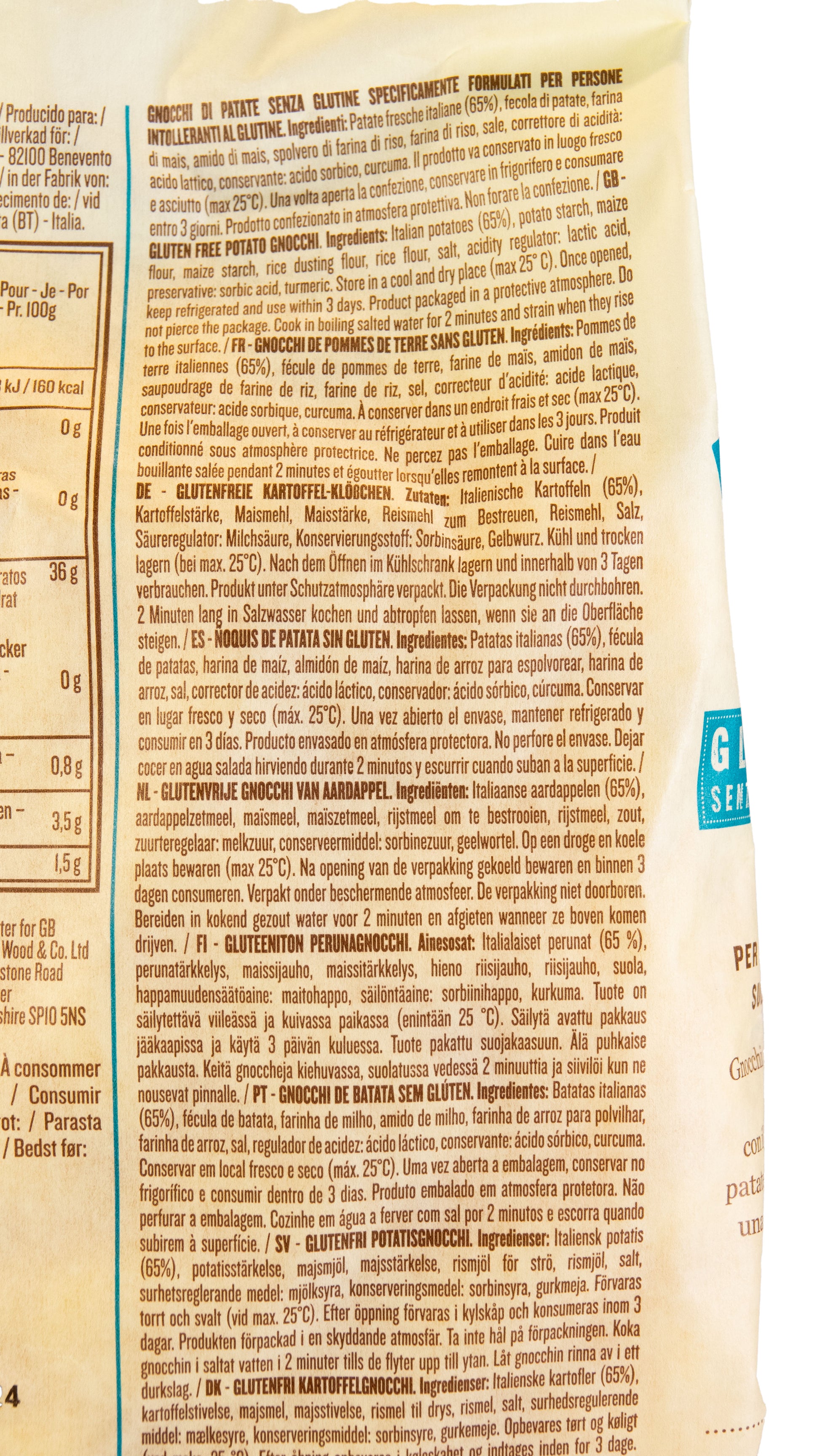 Italienische Kartoffeln, Kartoffelstärke, Maismehl, Maisstärke, Reismehl, Salz; Säureregulator: Milchsäure E270; Konservierungsstoff: Ascorbinsäure E200; Kurkuma.