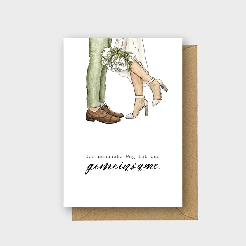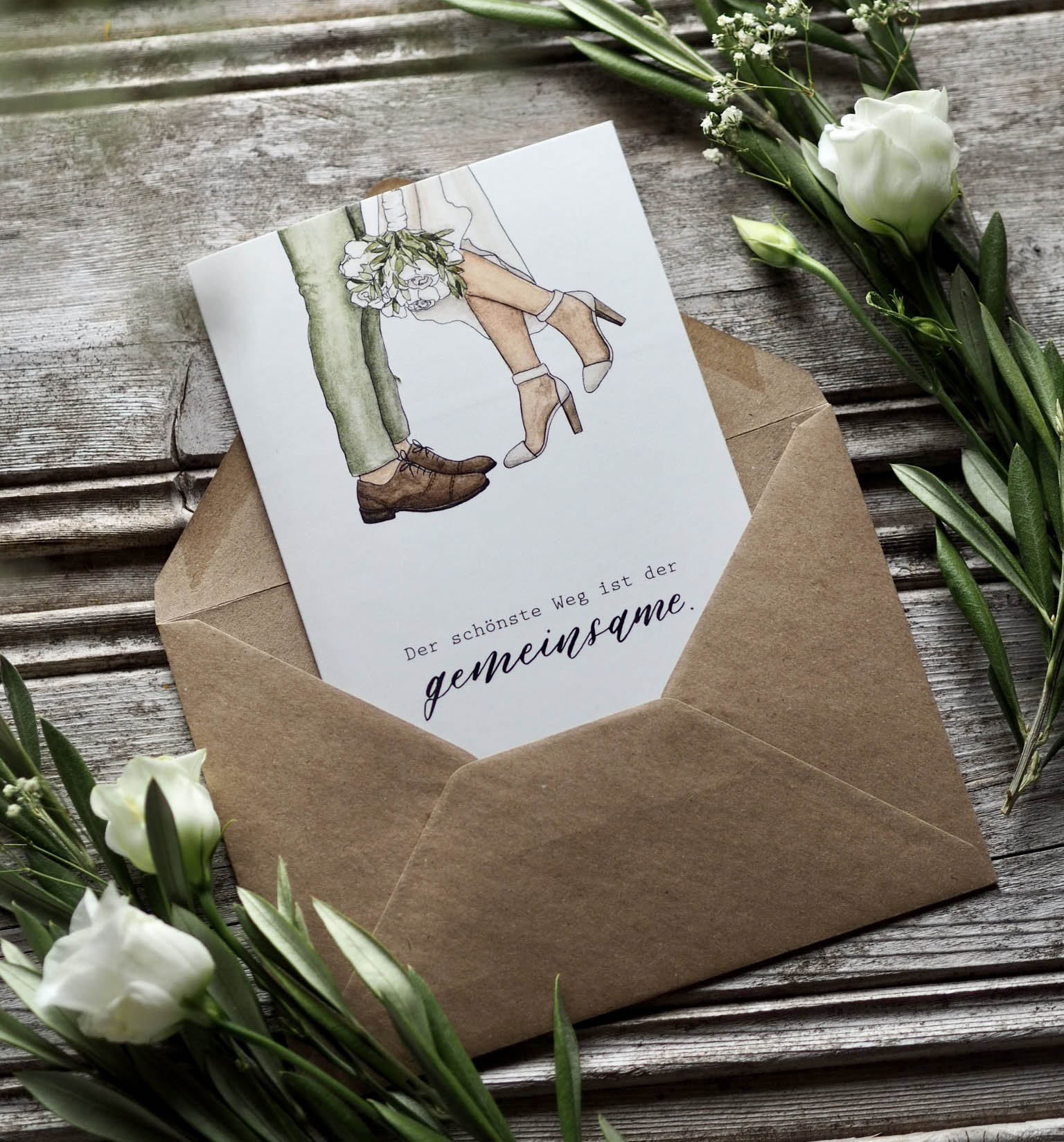 Die Klappkarte wird rückseitig in einen passenden Umschlag aus braunem Recyclingpapier gesteckt, sodass Karte und Umschlag fest zusammen bleiben.