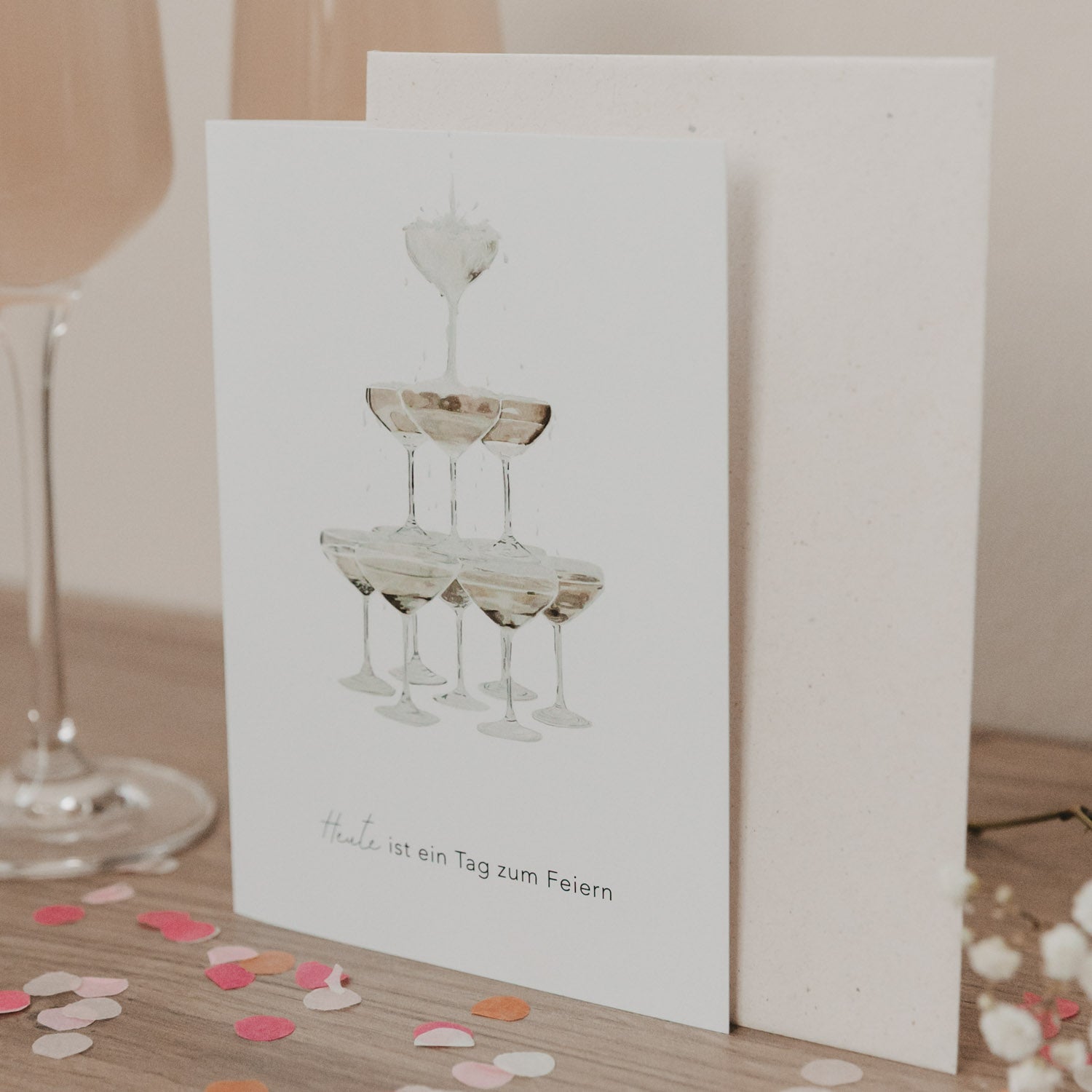 Mit der Klappkarte "Champagner" bringst du die richtige Stimmung für jeden besonderen Moment! Der fröhliche Spruch „Heute ist ein Tag zum Feiern“ lädt dazu ein, das Leben zu genießen – ob Geburtstag, Hochzeit oder Jubiläum.