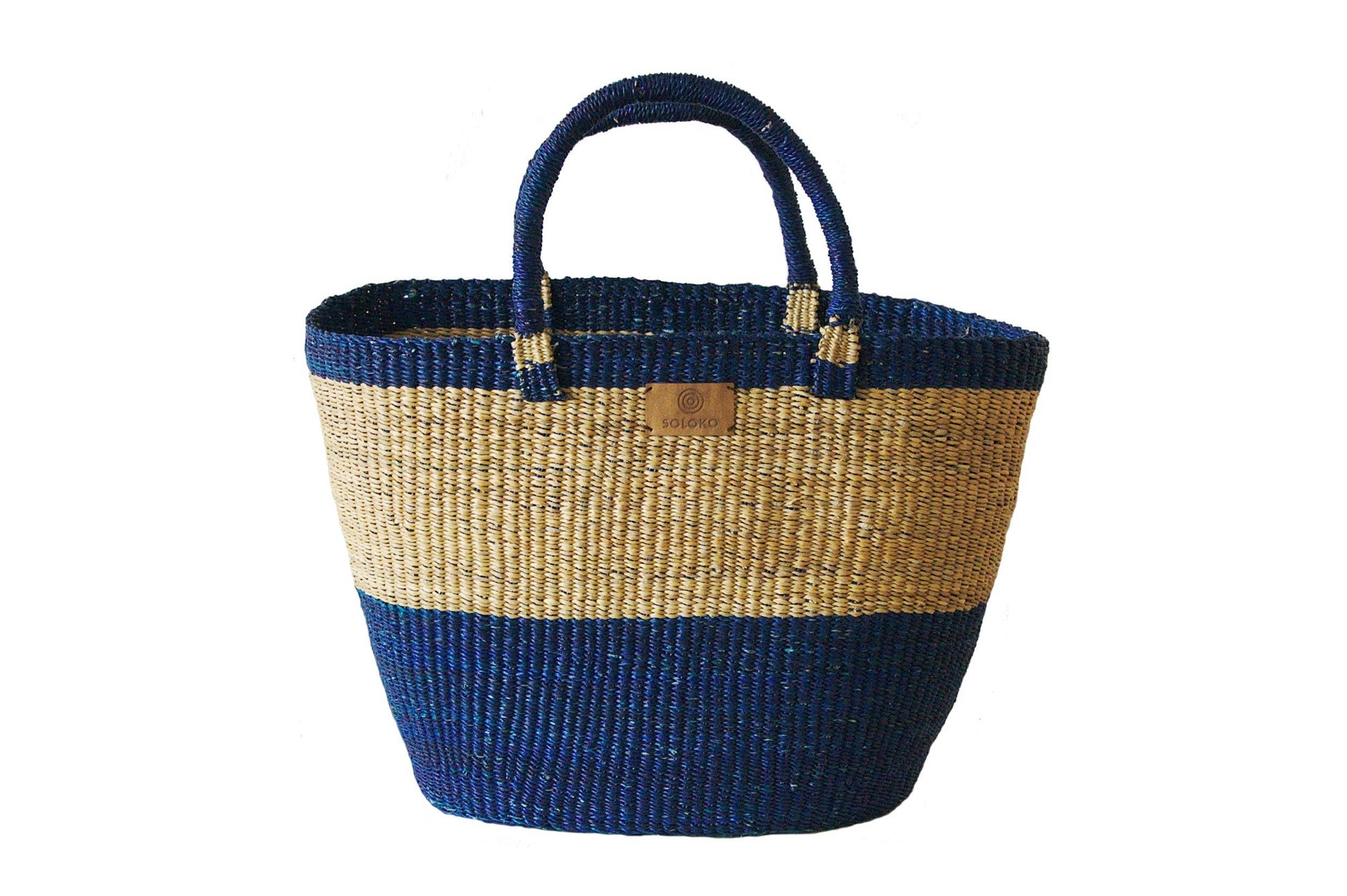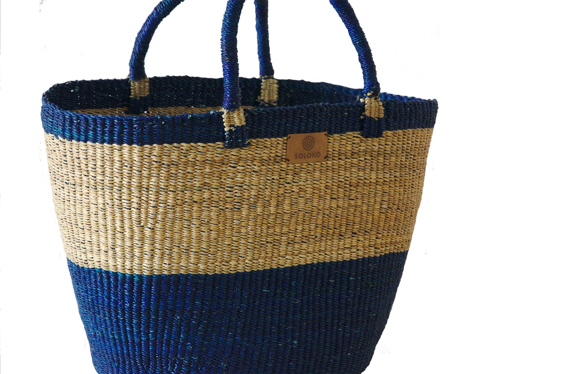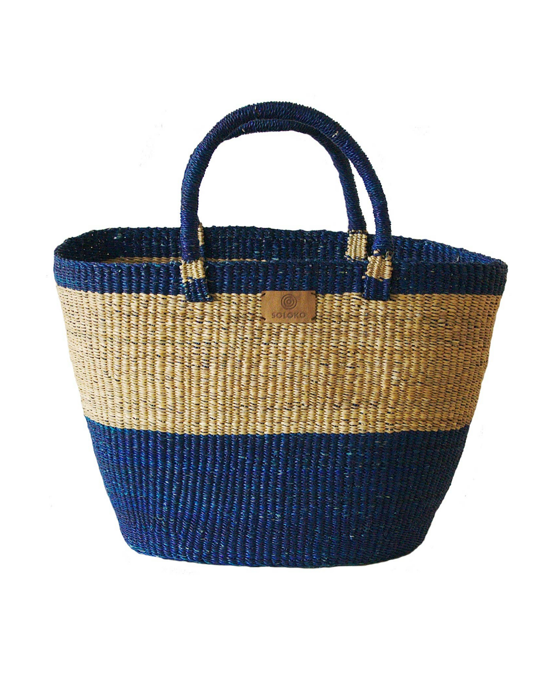 Delali wird wie ihre größere Schwestern in aufwändiger Handarbeit von erfahrenen Kunsthandwerkern im Norden von Ghana hergestellt. Delali ist etwas kleiner als Korbtasche Dela und ist in verschiedenen Farben und Mustern erhältlich. Jeder Korb ist ein Unikat. Da es sich um einen handgefertigten Artikel handelt, kann jedes Stück leicht variieren und somit Unregelmäßigkeiten und Abweichungen in Design, Größe und Farbe aufweisen. Dies sind keine Mängel, sondern Teil dessen, was jedes Stück einzigartig machen. Farbe: dunkelblau, natur Größe: Breite: 40-44 cm Höhe: 29-30 cm