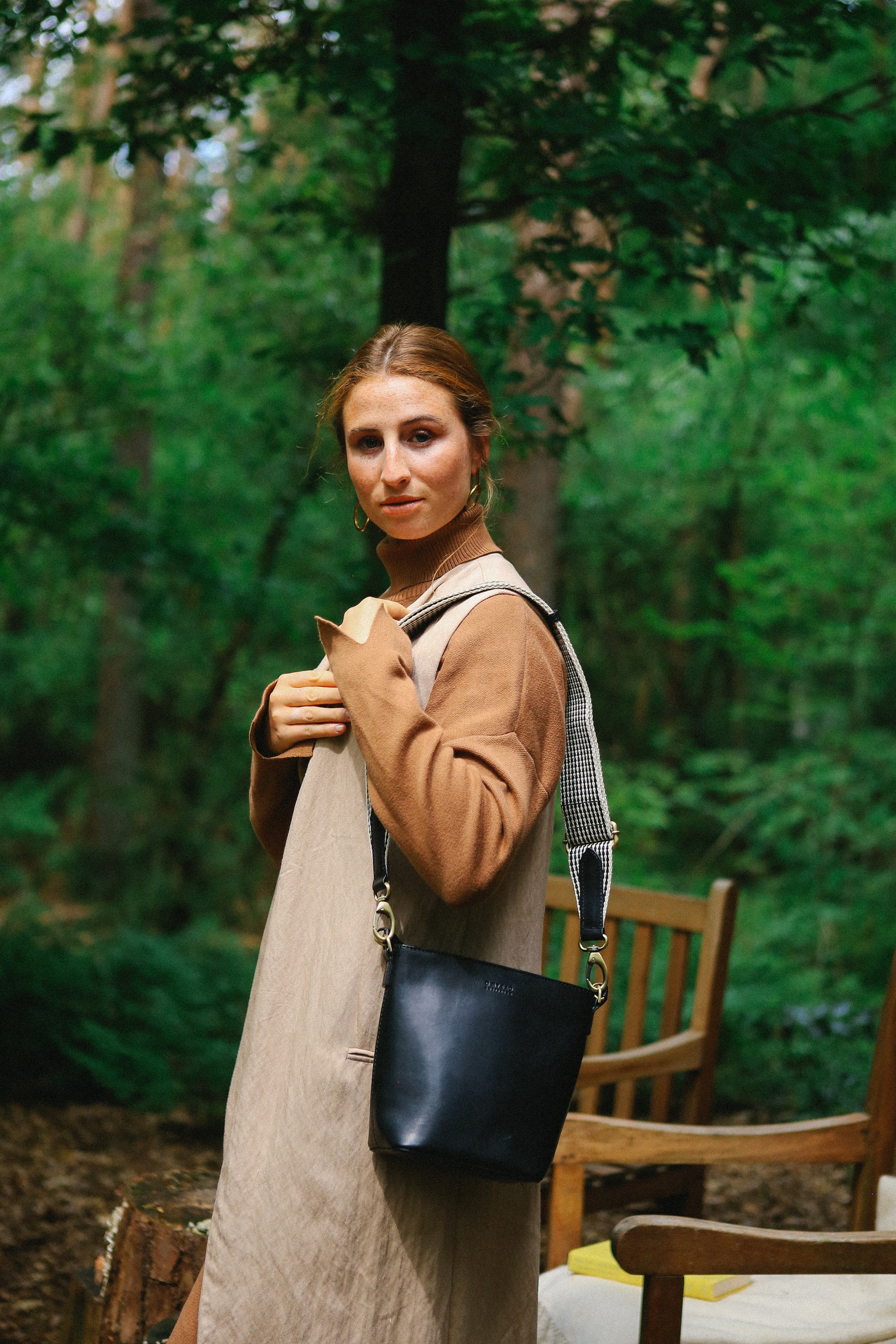 Diese schicke Bucket Bag hat ein geräumiges Interieur und eine Einschubtasche, in der du deine kleinen Essentials im Handumdrehen finden kannst. Mit einem flachen Boden entworfen, steht Bobbi auf eigenen Füßen und zieht die Aufmerksamkeit auf sich. Trage sie entweder am oberen Griff oder als Crossbody Bag. Möchtest du etwas sie aufpeppen? Ihr Hundehakenverschluss ermöglicht es dir, unsere Checkered-Webbing-Träger zu mixen und anzupassen! Bobbi ist perfekt für eine Nacht oder einen Ausflug an den Strand. Sie ist unser go-to Girl für jeden Anlass.