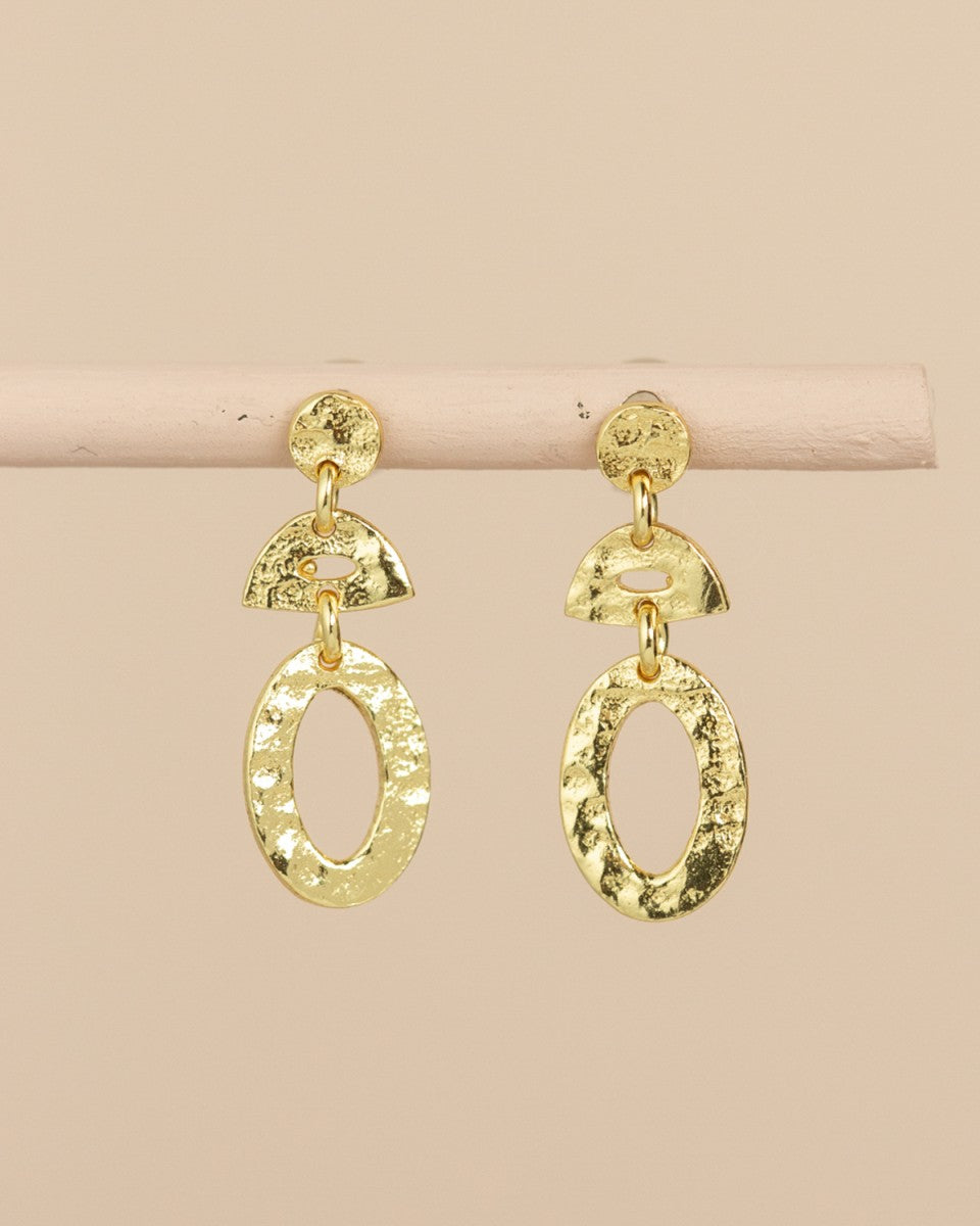 Die Junebug Ohrstecker vereinen moderne Geometrie mit handwerklichem Charme: Ein Trio aus Kreis, Halbkreis und Oval – fein gehämmert und in edlem Gold-Finish – macht diesen Ohrschmuck zu einem echten Blickfang. Die strukturierte Oberfläche reflektiert das Licht sanft und verleiht dem minimalistischen Design eine außergewöhnliche Tiefe.