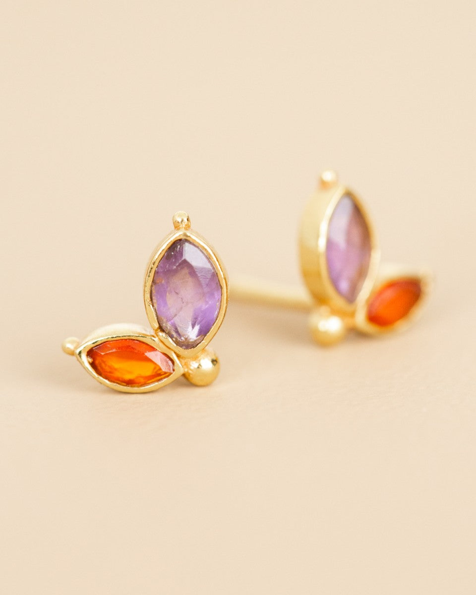 Vergoldete Ohrstecker „Butterfly“ mit Amethyst & rotem Achat – elegante Farbkomposition