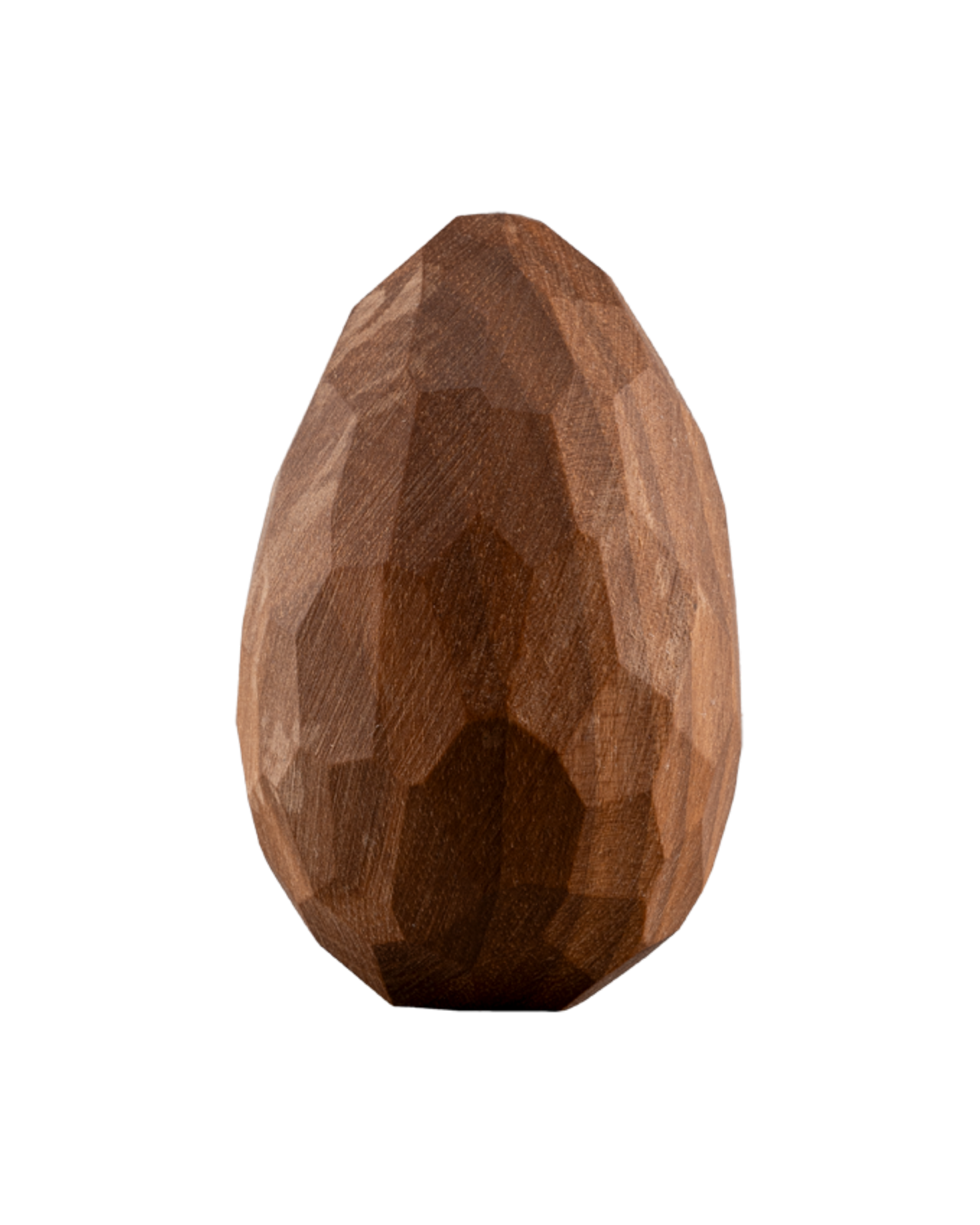 Das naturbelassene Nussholz bringt eine warme, lebendige Maserung mit sich. Die facettierte Gestaltung verleiht dem Ei eine moderne, skulpturale Leichtigkeit und verbindet klassische Handwerkskunst mit zeitgemäßem Design.