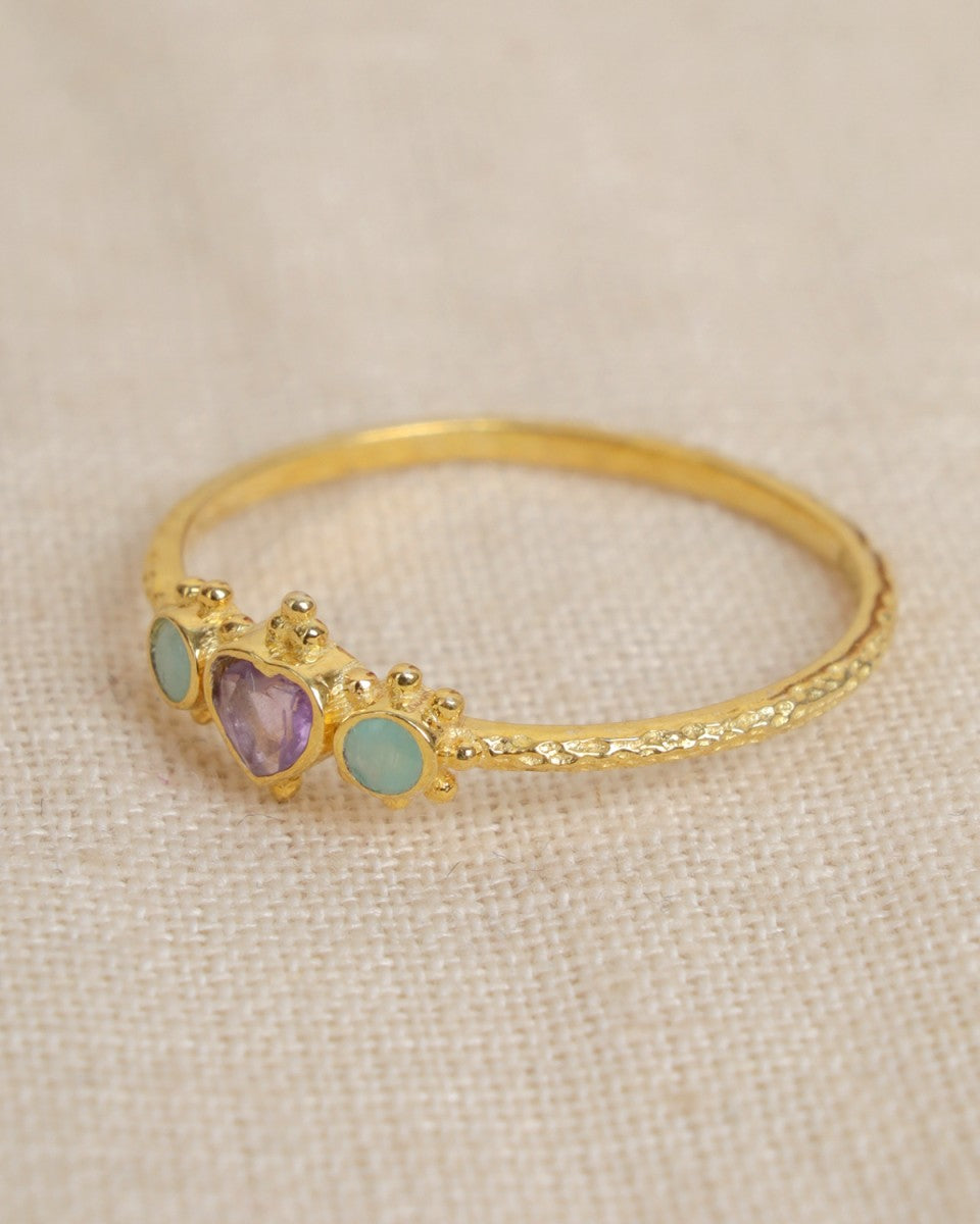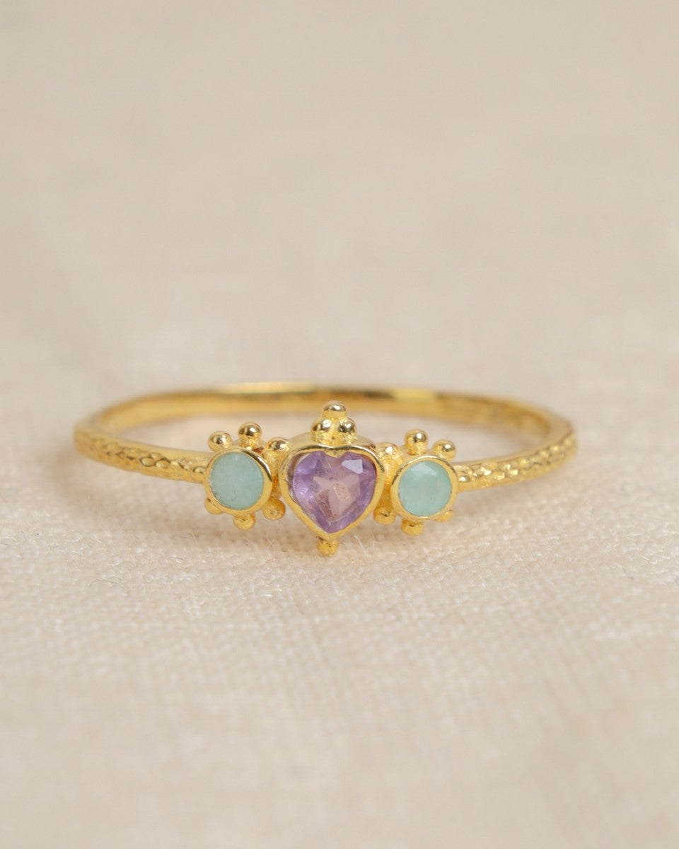 Eleganter Ring von MUJA JUMA aus vergoldetem, leicht gehämmertem Sterlingsilber 925. Dieser stilvolle Ring vereint zwei kleine Amazonit-Steine und einen herzförmigen Amethyst in der Mitte und verleiht jedem Look eine feminine Note. Ein zeitloses Schmuckstück, das perfekt für besondere Anlässe oder den Alltag geeignet ist. 100% nickelfrei und cadmiumfrei.