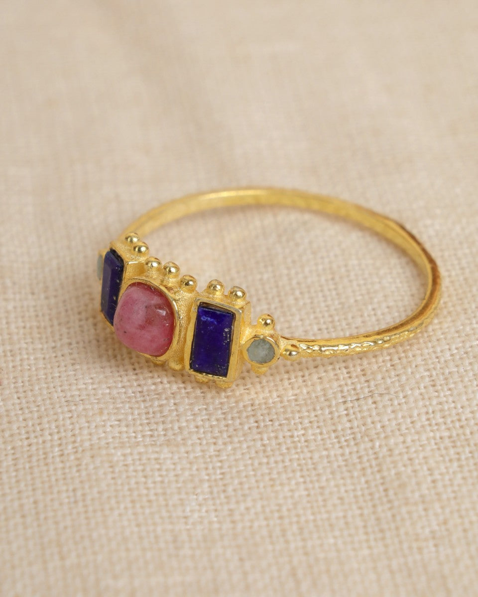 Entdecken Sie den zeitlosen Charme dieses MUJA JUMA Rings, der aus hochwertigem, vergoldetem Sterlingsilber (925) gefertigt ist. Das Design kombiniert verschiedene Edelsteine miteinander.