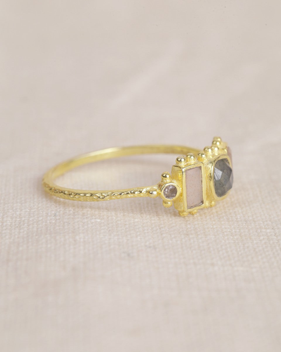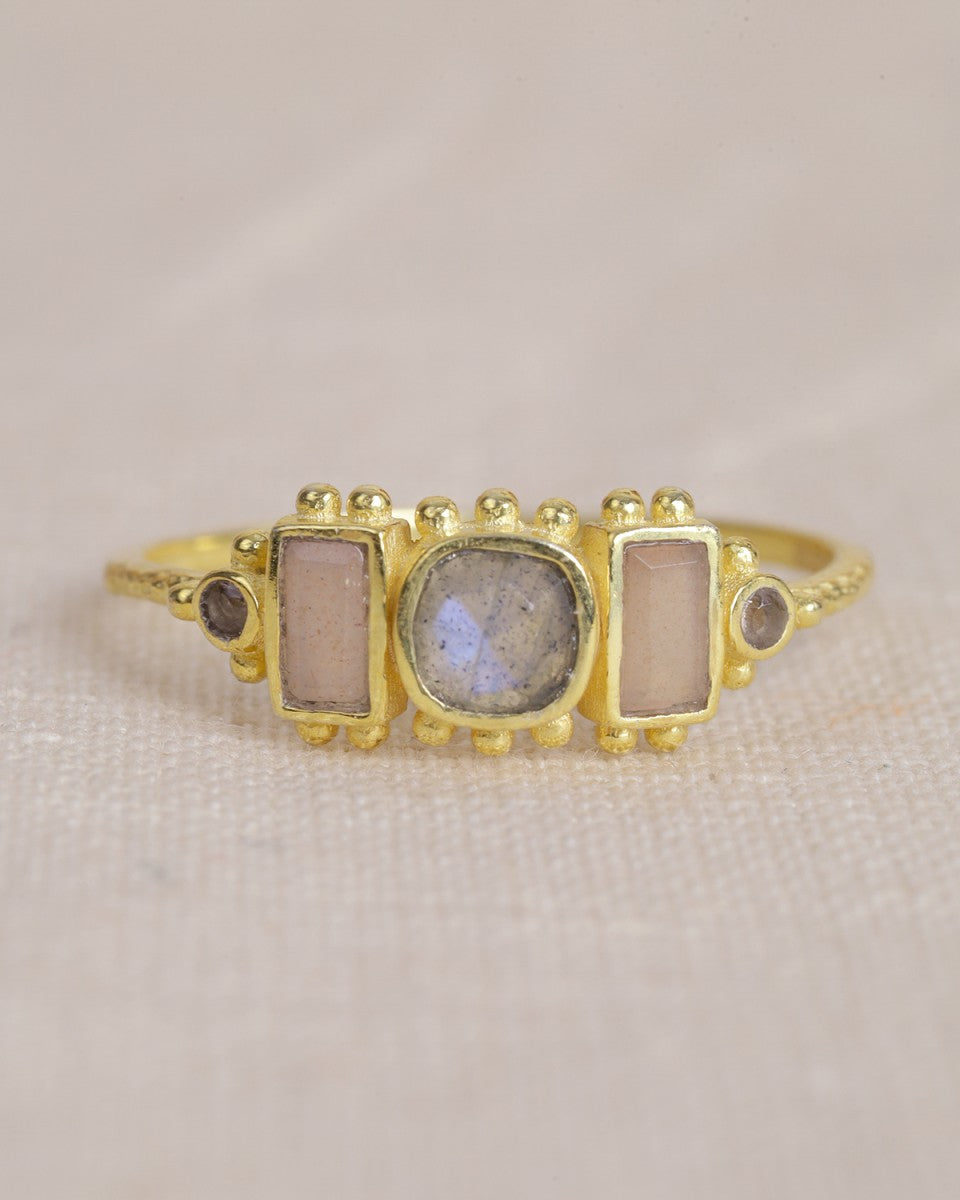 Entdecken Sie den zeitlosen Charme dieses MUJA JUMA Rings, der aus hochwertigem, vergoldetem Sterlingsilber (925) gefertigt ist. Das Design kombiniert verschiedene Edelsteine miteinander.
