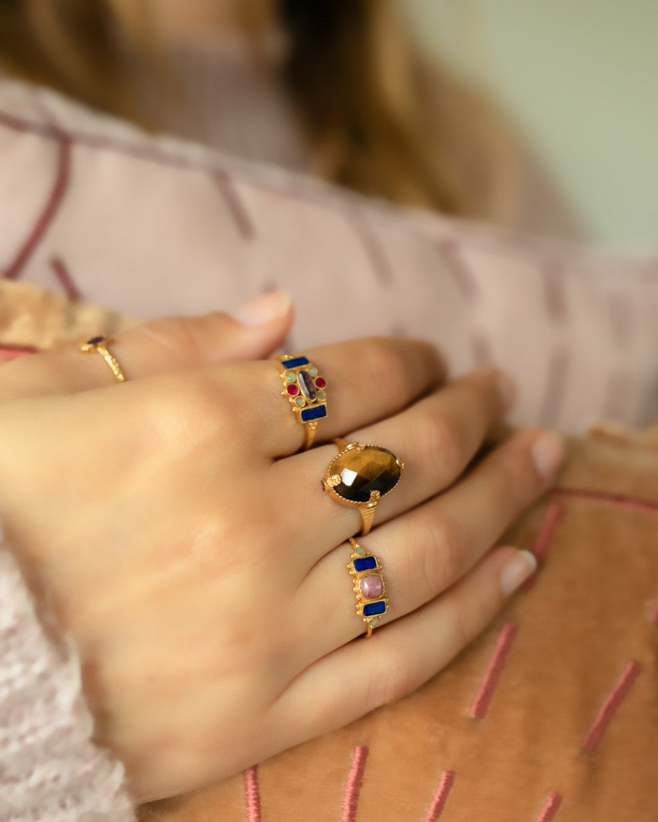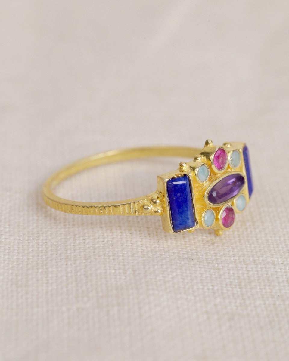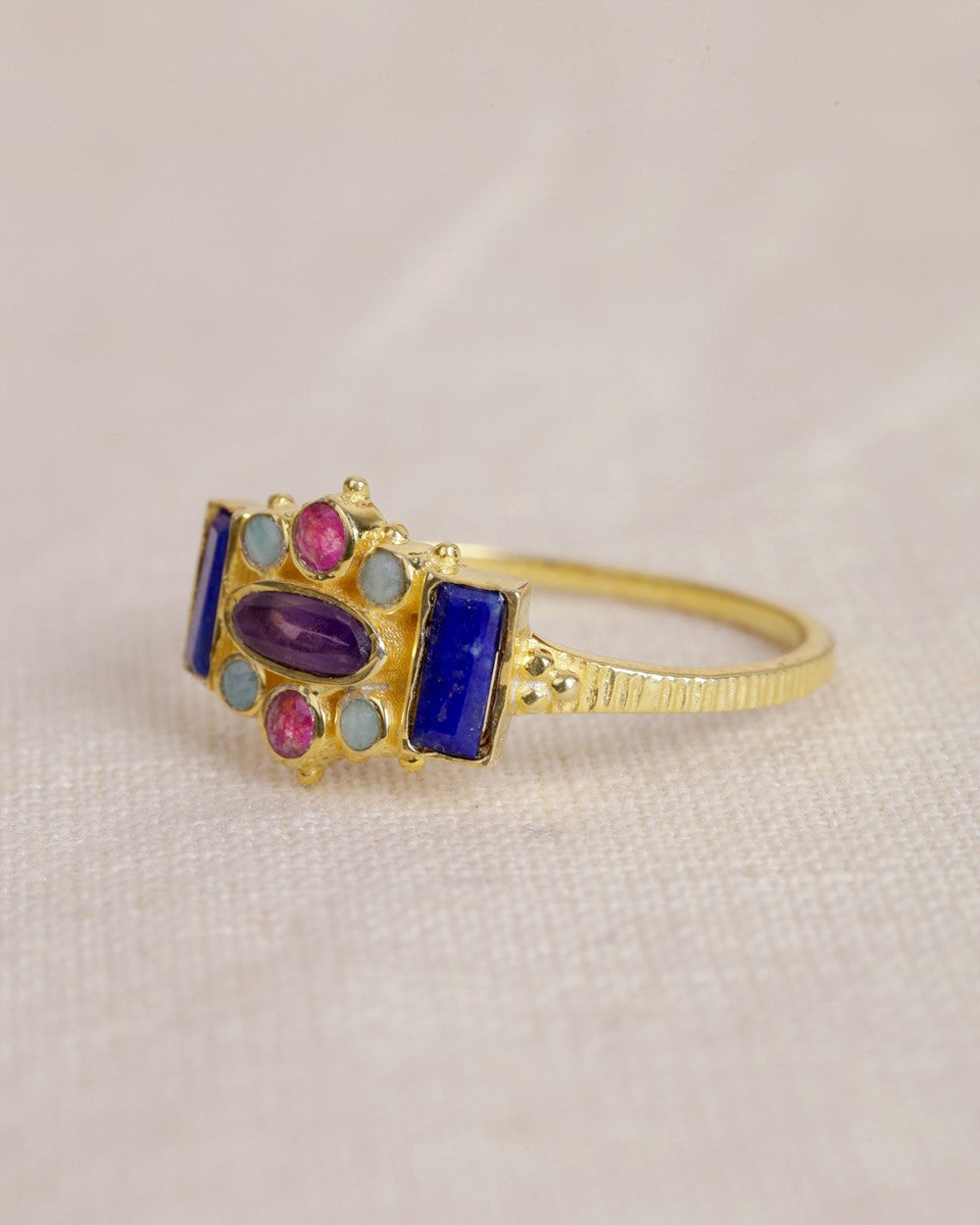 Verleihen Sie Ihrem Look mit diesem exquisiten MUJA JUMA Ring einen Hauch von Glamour. Der Ring ist aus hochwertigem, vergoldetem Sterlingsilber (925) gefertigt und kombiniert eine harmonische Auswahl an edlen Steinen, darunter zwei ovalen Amethysten (6 mm), zwei rechteckige Lapislazuli (5 mm), einen runden Rubin (2 mm) und einen zarten Amazonit (1,5 mm).