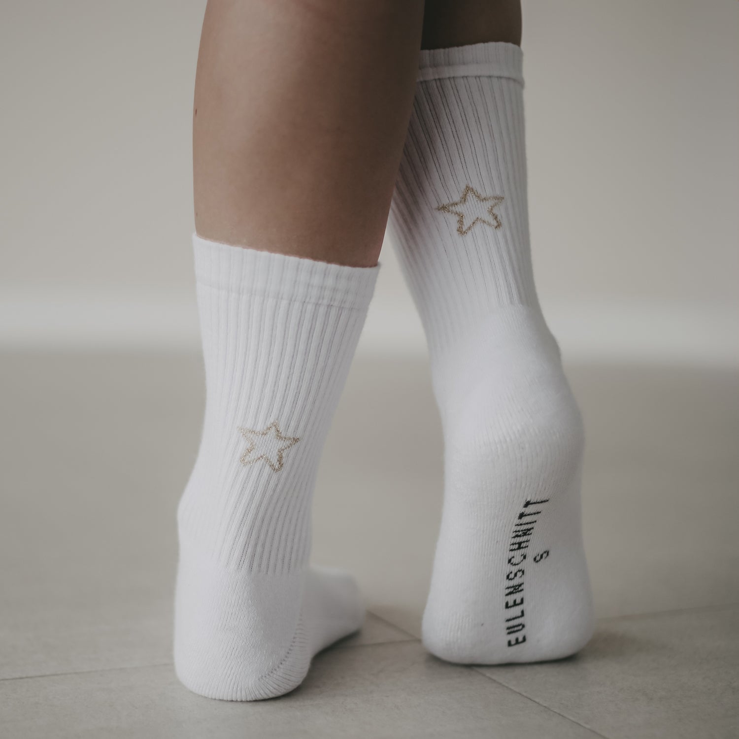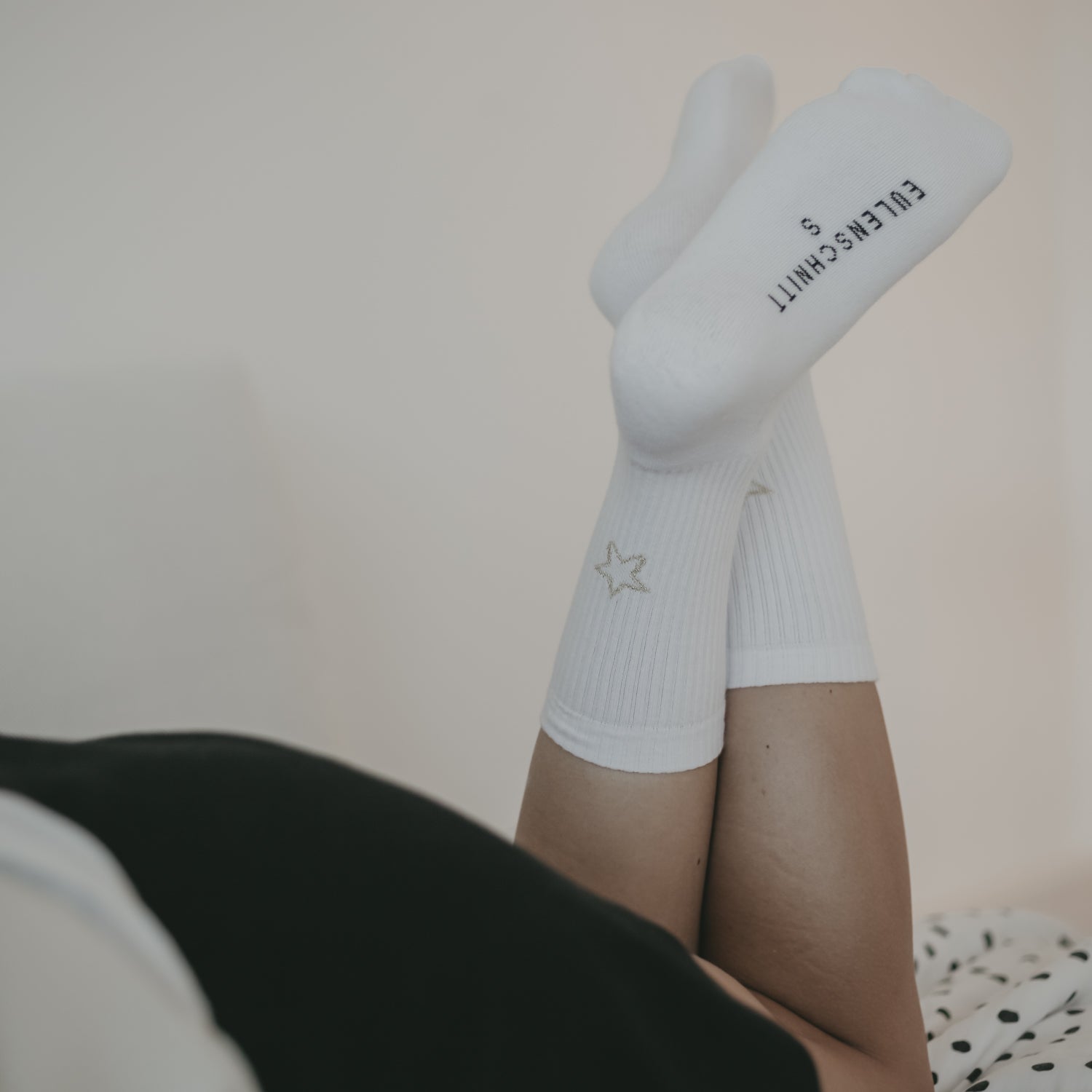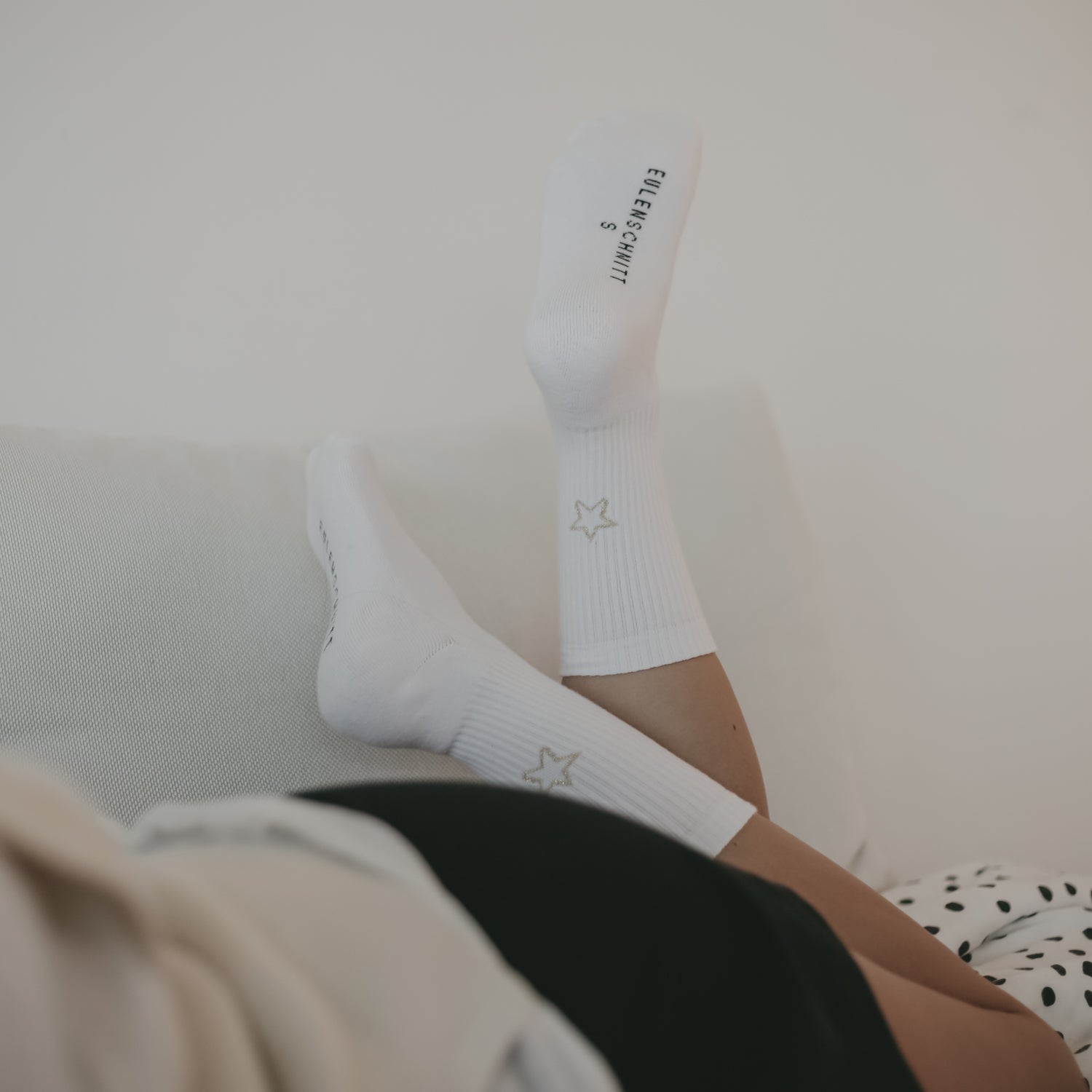 Die weißen Eulenschnitt Socken mit Stern sind ein zeitloser Klassiker für alle, die schlichte Eleganz lieben. Hergestellt aus hochwertiger Baumwollmischung, bieten sie höchsten Tragekomfort und ein angenehmes Fußgefühl – perfekt für den Alltag oder als kleines Geschenk. Das minimalistische Sternmotiv macht diese Socken zu einem stilvollen Accessoire, das zu jedem Outfit passt. Ideal für Fans von nachhaltiger Mode und liebevollen Details.