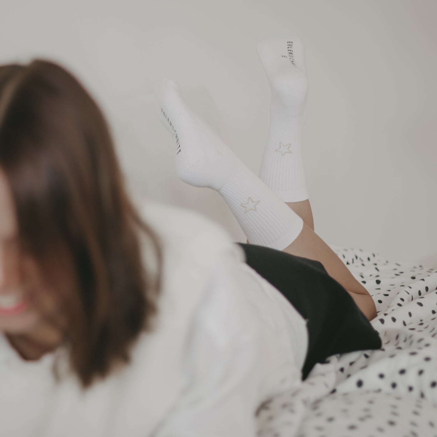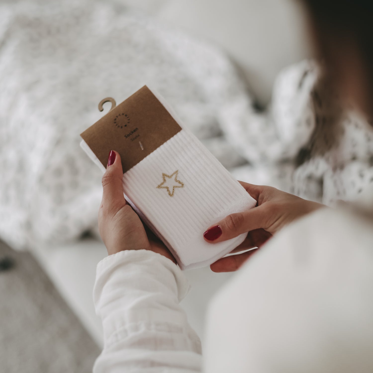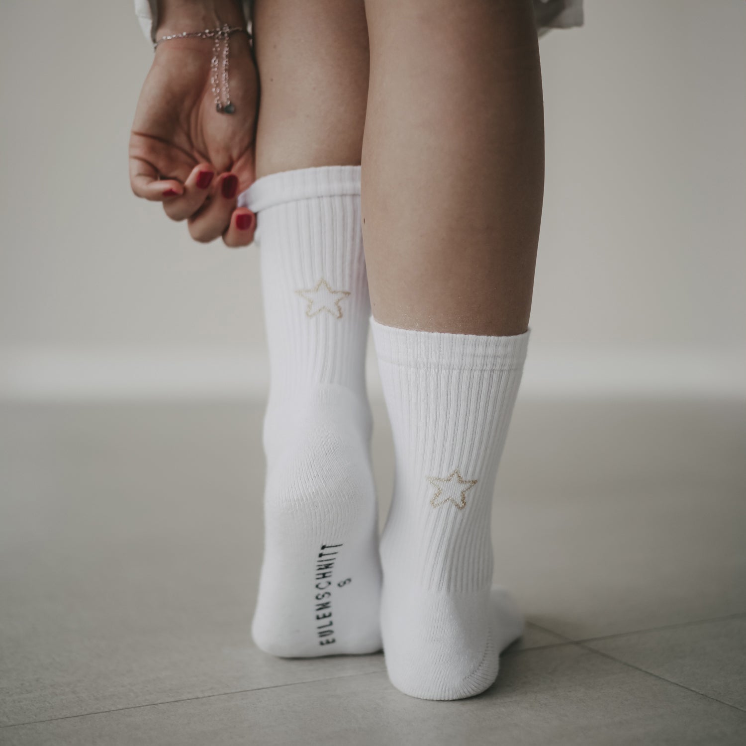 Die weißen Eulenschnitt Socken mit Stern sind ein zeitloser Klassiker für alle, die schlichte Eleganz lieben. Hergestellt aus hochwertiger Baumwollmischung, bieten sie höchsten Tragekomfort und ein angenehmes Fußgefühl – perfekt für den Alltag oder als kleines Geschenk. Das minimalistische Sternmotiv macht diese Socken zu einem stilvollen Accessoire, das zu jedem Outfit passt. Ideal für Fans von nachhaltiger Mode und liebevollen Details.