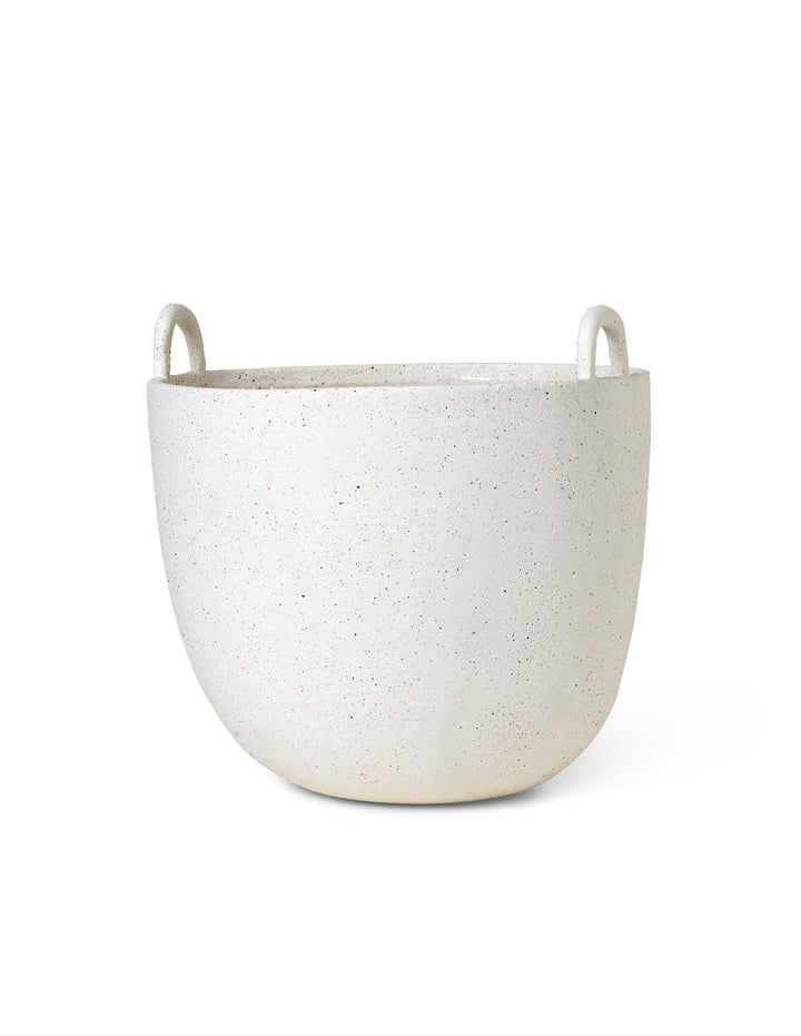 Unser unverwechselbarer Steinguttopf bietet eine überdimensionale Form und ist an der Außenseite nicht glasiert, damit die natürliche, gesprenkelte Oberfläche, die dem Design sein handwerkliches Flair verleiht, bewahrt bleibt. Der große Topf mit Griffen kann als kunstvollen Behälter für eine große Pflanze oder als ausdrucksvolle Aufbewahrung für Decken oder Stofftiere dienen, oder schlicht als dekoratives Objekt Verwendung finden.