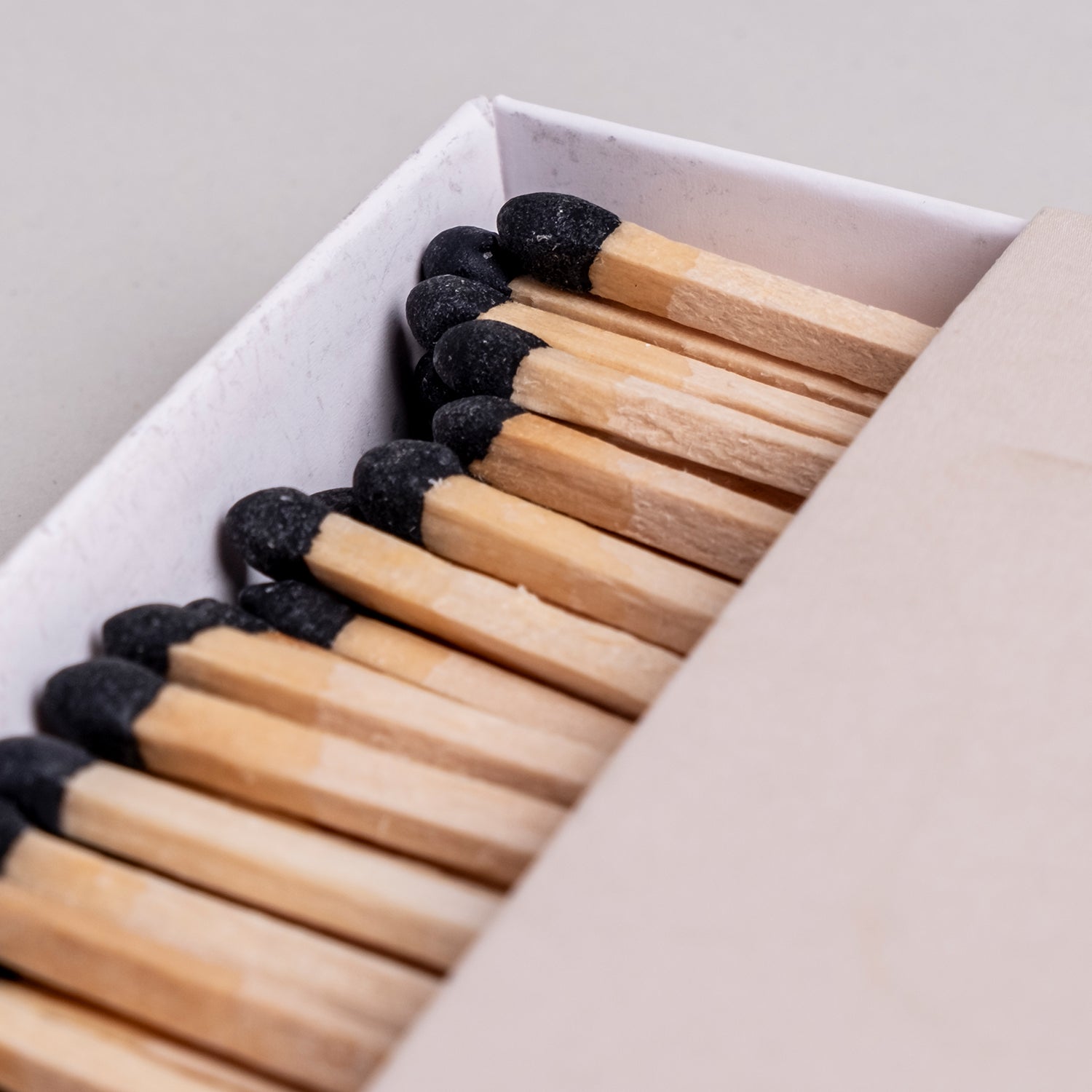 - Streichholzschachtel mit 60 Streichhölzern. Streichholzköpfe schwarz. Material: Holz, Papier