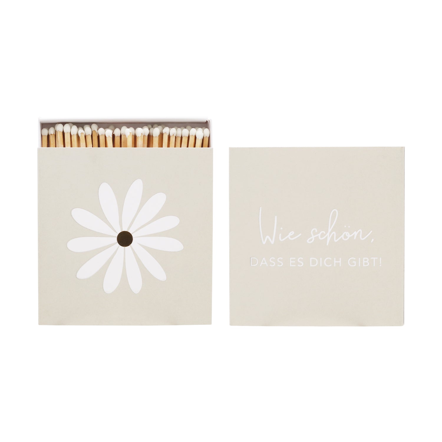 Mit dieser Streichholzschachtel zauberst du ein Lächeln ins Gesicht. Unsere Streichhölzer Daisy, haben ein wundervoll schlichtes Design mit edler Blindprägung. Das Innere der Blüte ist durch goldene Heißfolienprägung veredelt. Die andere Seite ziert der Spruch "Wie schön, dass es dich gibt." Die Streichhölzer haben eine tolle Länge von ca. 9,5 cm und einen weißen Zündkopf.