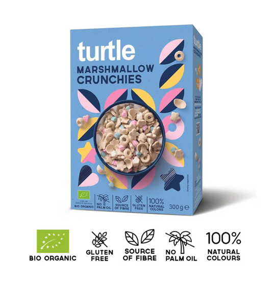 Mit den glutenfreien Turtle Marshmallow Crunchies wird jeder Morgen zu einem kleinen Highlight! Knusprige, goldbraun geröstete Haferflocken mit feinem Vanillegeschmack treffen auf bunte, luftig-leichte Marshmallows – eine unwiderstehliche Kombination, die Kindheitserinnerungen weckt und einfach gute Laune macht.